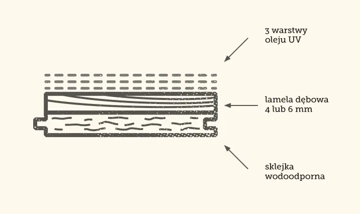 Olej UV wnika w strukturę drewna, dzięki czemu podkreśla jego naturalne piękno i jednocześnie zabezpiecza podłogę. W swojej strukturze olej UV trochę przypomina lakier – oprócz tego, że wnika w drewno i zamyka w nim pory, to dodatkowo tworzy na jego powierzchni powłokę podobną do struktury lakieru dzięki czemu pielęgnacja i konserwacja tak zabezpieczonej podłogi jest bardzo prosta.