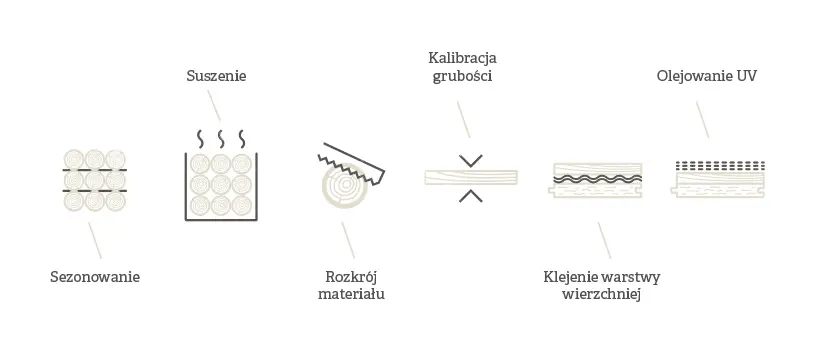 Wierzchnia warstwa podłogi flooro jest produkowana z dębu, który przed suszeniem jest sezonowany. Następnie cały proces suszenia mechanicznego w komorach jest prowadzony według autorskiej metody, dzięki której naprężenia w drewnie są eliminowane do minimum. Efektem tego są podłogi flooro, które charakteryzują się bardzo dużą stabilnością wymiarową.