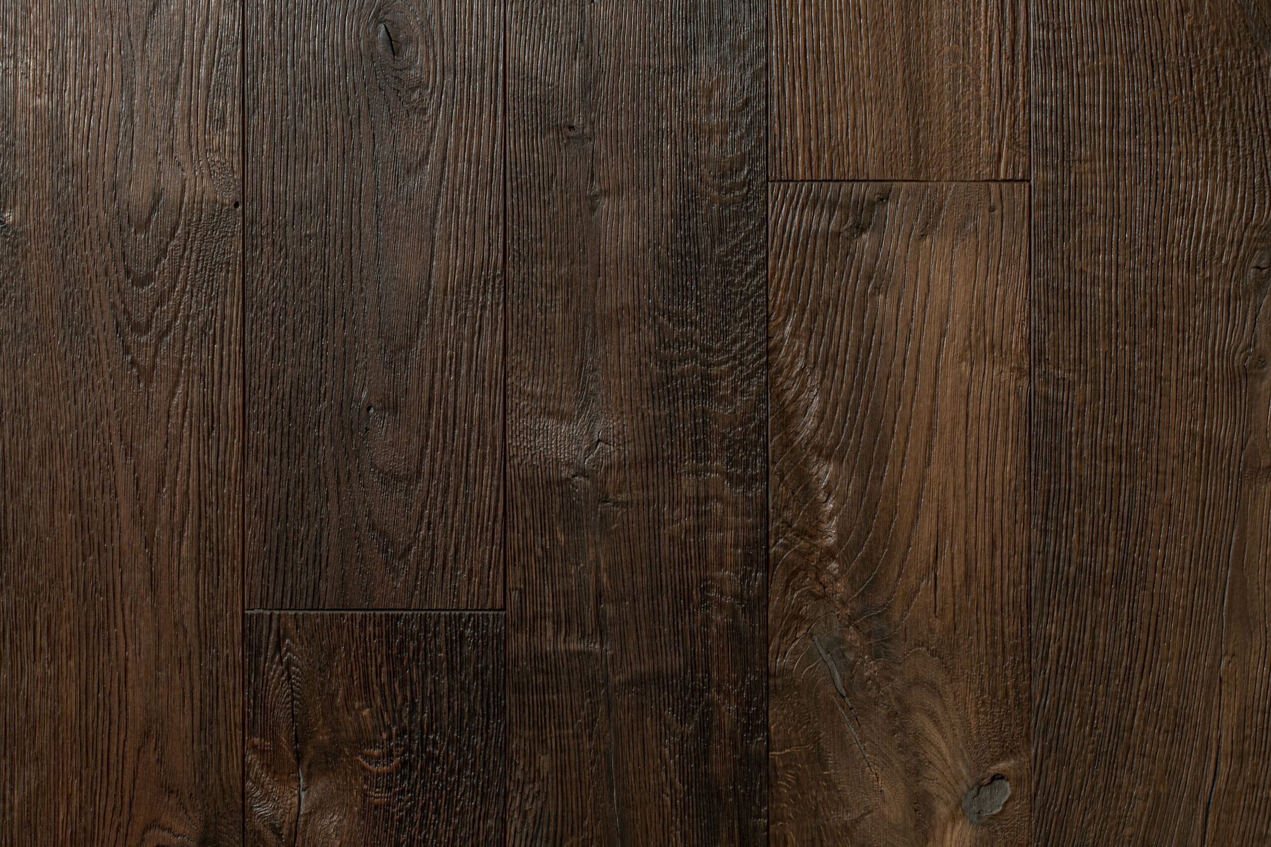 Mocno rustykalna podłoga o głębokiej ciemnej barwie z zastosowaniem metody ręcznego heblowania i nieregularnej fazie.