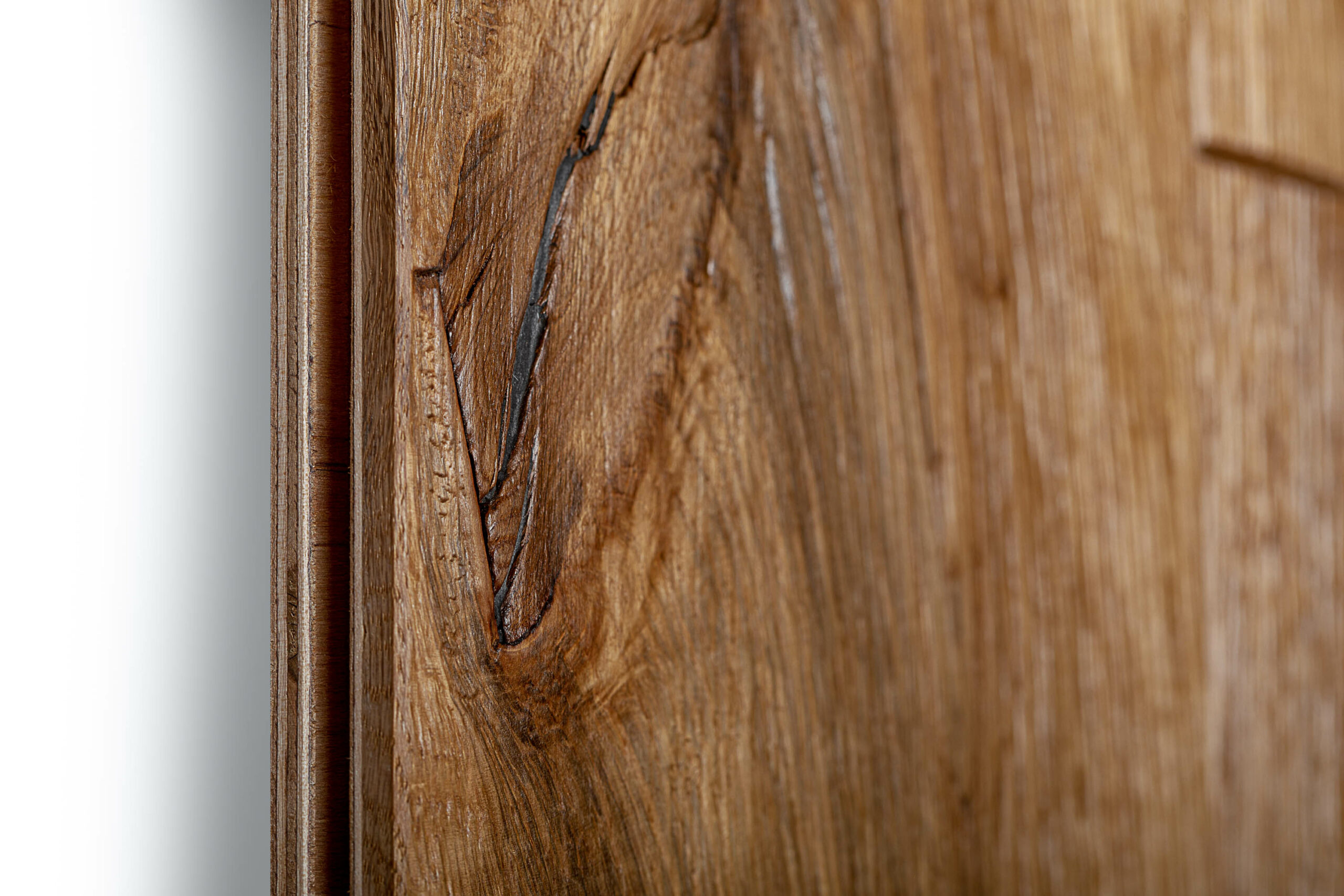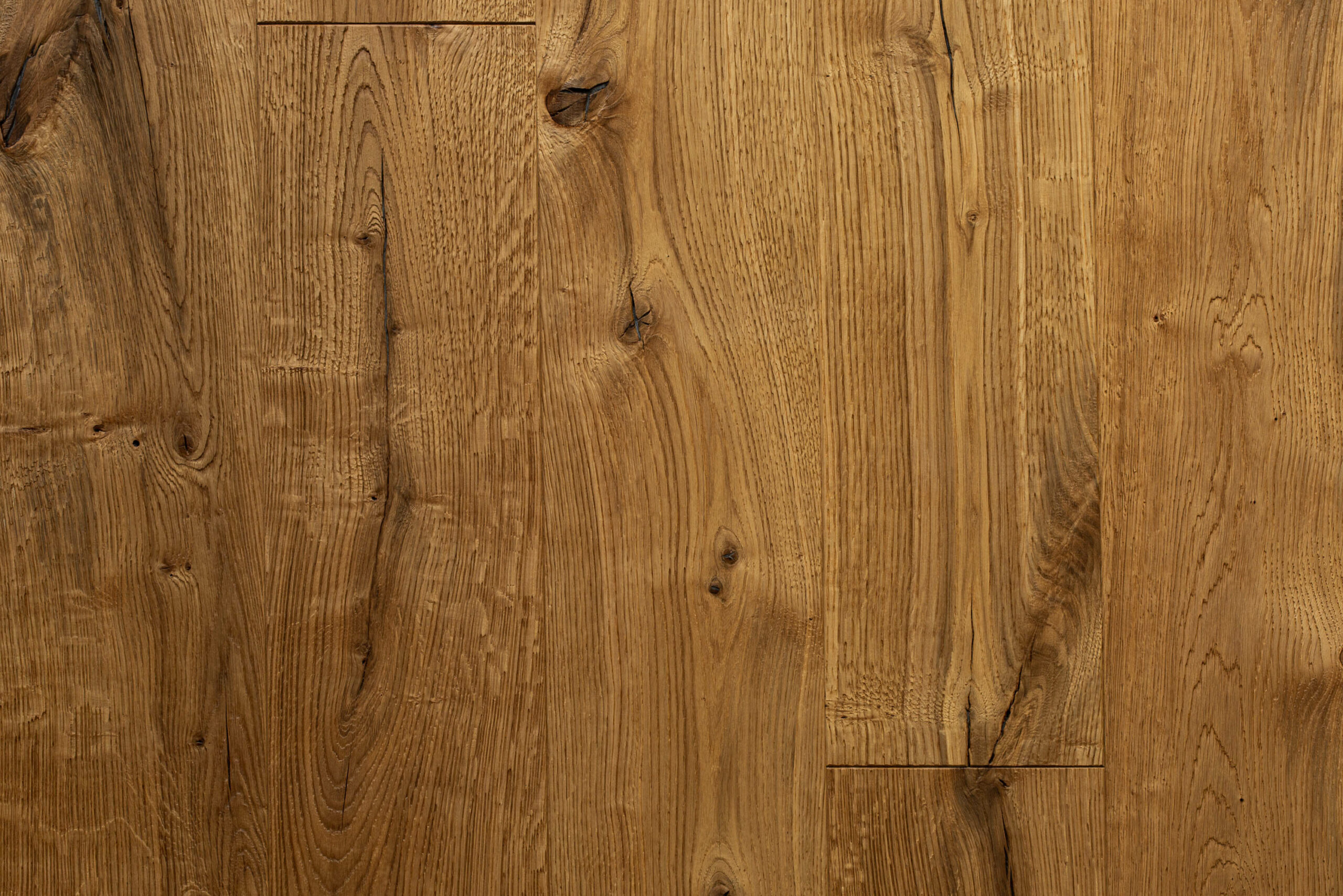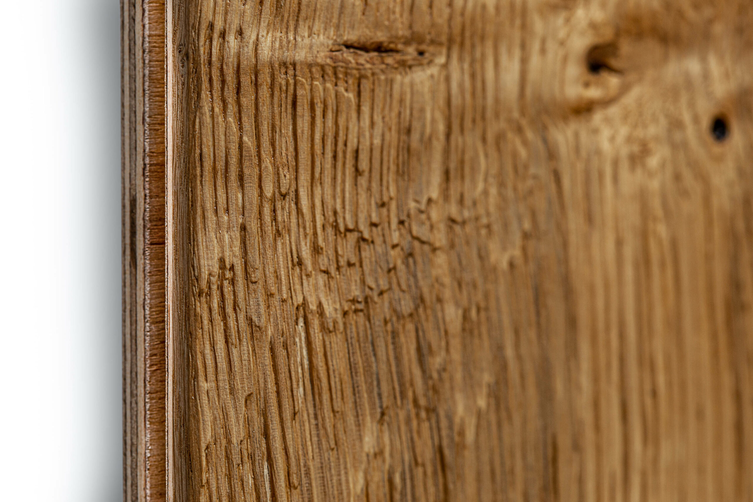 Deska dębowa postarzana z nieregularną powierzchnią, z bardzo mocną szczotką oraz usłojeniem o dużej ilości cech drewna dębowego w klasie rustykalnej.