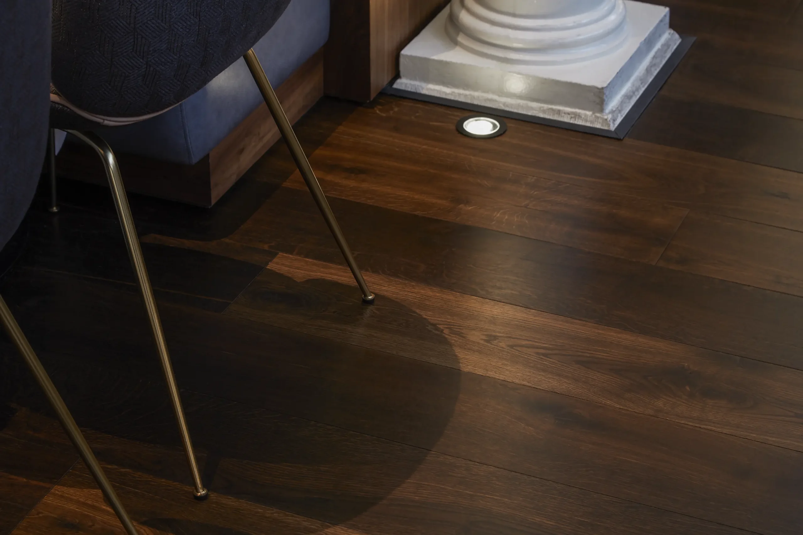 Podłoga o głębokiej ciemnobrązowej barwie.